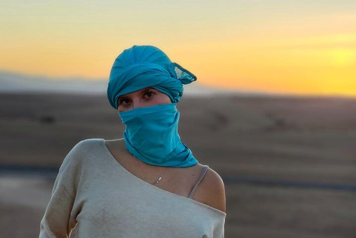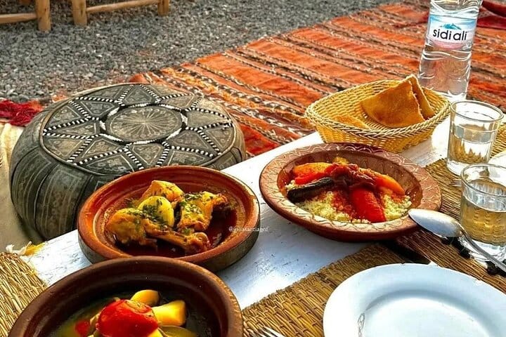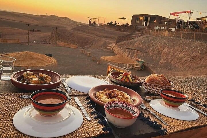 Escape to the Agafay Desert for a magical evening just one hour from Marrakech. Experience the breathtaking golden sunset over the rugged landscape before settling in for a gourmet dinner under the vast, starry sky. Your meal features authentic Moroccan cuisine enhanced with precious argan oil, sourced directly from local women's cooperatives. Learn how your visit supports female empowerment and sustainable community development, adding profound meaning to your journey.