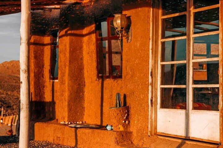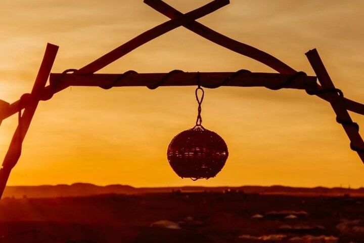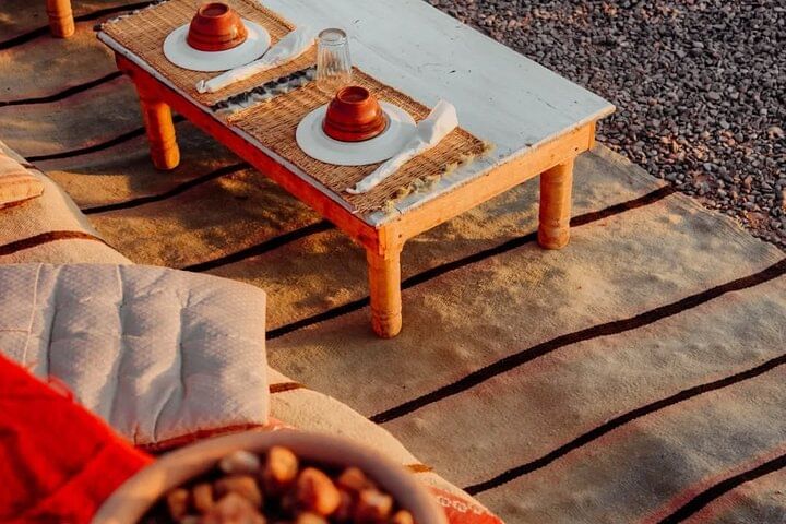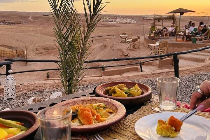 Escape to the Agafay Desert for a magical evening just one hour from Marrakech. Experience the breathtaking golden sunset over the rugged landscape before settling in for a gourmet dinner under the vast, starry sky. Your meal features authentic Moroccan cuisine enhanced with precious argan oil, sourced directly from local women's cooperatives. Learn how your visit supports female empowerment and sustainable community development, adding profound meaning to your journey.